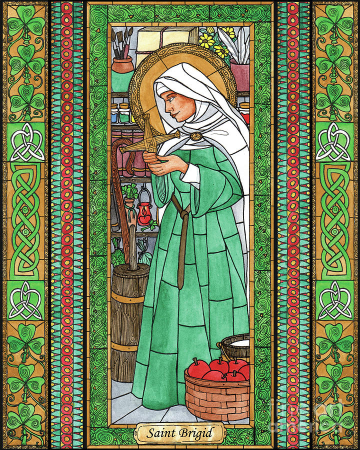 Brigid performed many miracles. She could drive out demons simply by making the sign of the Cross. She healed the sick, converted sinners, and even once hung her cloak on a sunbeam. Brigid also founded a school of art for metalwork and illumination. As a mother figure to the girls, Brigid taught them skills so they could go out on their own and possibly marry and raise a family. Brigid raised dairy cattle where she taught the girls to make cheese, and butter and also sell milk to villagers. Stories of Brigid’s brewery where she made and sold beer are legendary as also gardening, sewing, nursing the sick, and housing abandoned children. Education was an important part of Brigid’s monastery and school where she trained young women to read.
